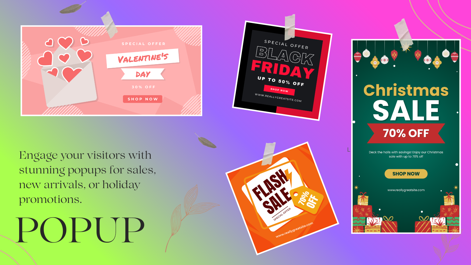 Engage visitors with stunning popups for "Sales", "New Arrivals", "Announcements", or "Holiday Promotions" — with 150+ modern, high-converting popup styles built for Shopify stores.