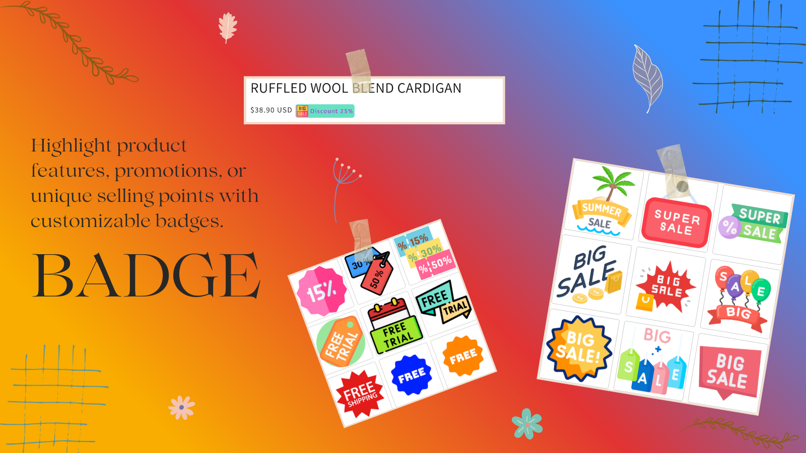 Badge feature helps merchants visually highlight product features, promotions, or unique selling points with customizable badges. Whether it's marking a Best-seller, limited stock, or eco-friendly product, the Badge App gives you the flexibility to place eye-catching text and image badges anywhere on the product page.