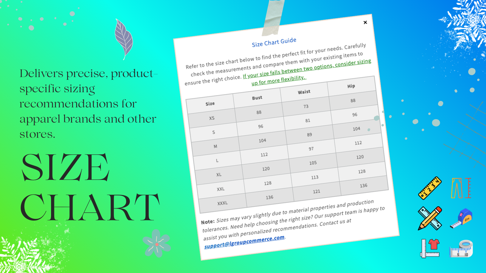 Size Chart delivers precise, product-specific sizing recommendations for apparel brands and other stores. With fully customizable and flexible size chart layouts, you can create a seamless shopping experience, ensuring customers always find the right fit — no coding required.