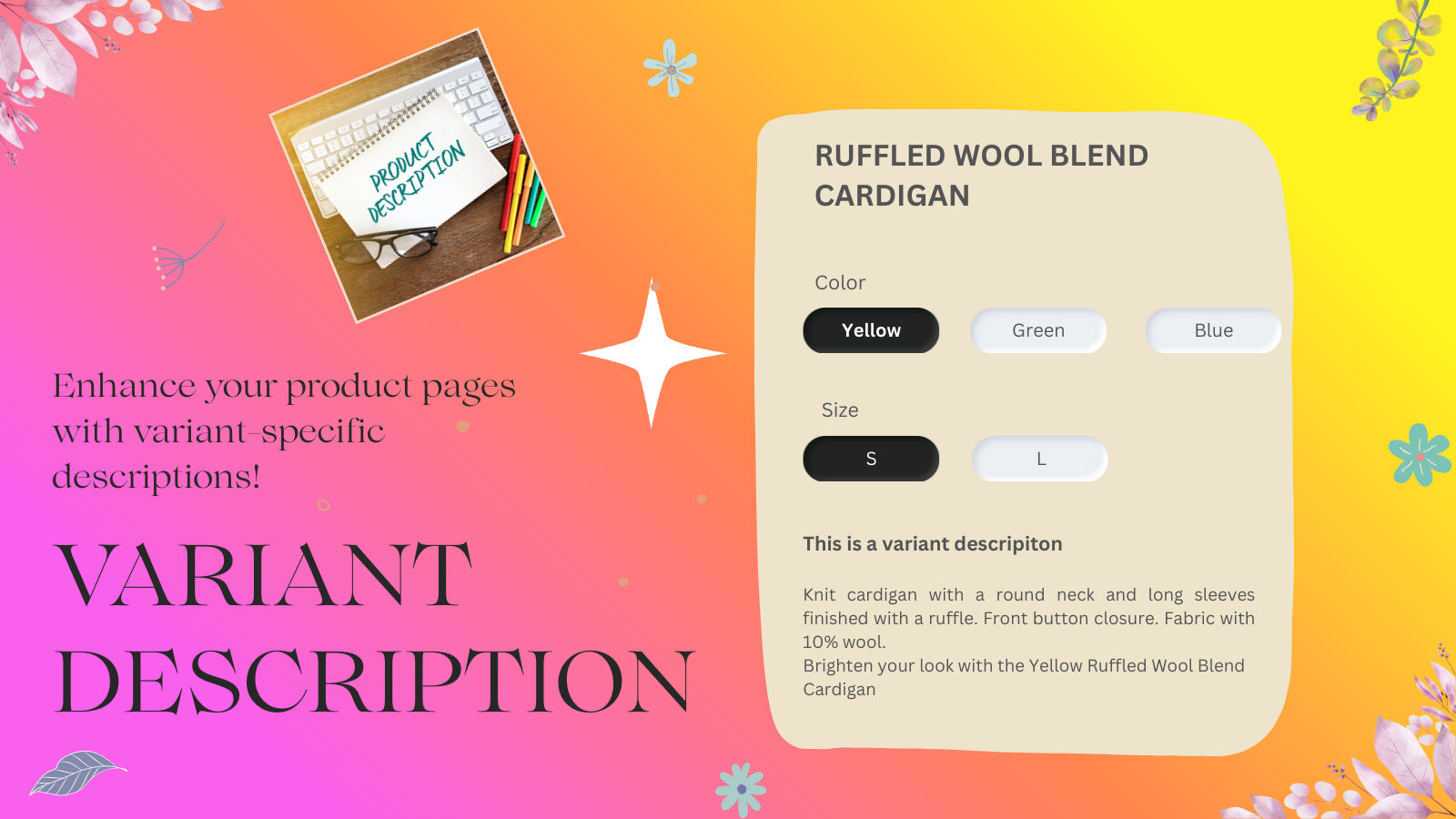 Variant Description enhance your product pages with variant-specific descriptions! Unlike Shopify’s default setup, where all variants share the same description, this app allows you to provide unique details for each variant — no coding required.